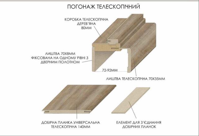 Комплектуючі (погодажні вироби) для дверей тільки телескопічні (це коли наличник і розширювач «застібається» в коробку без цвяхів):